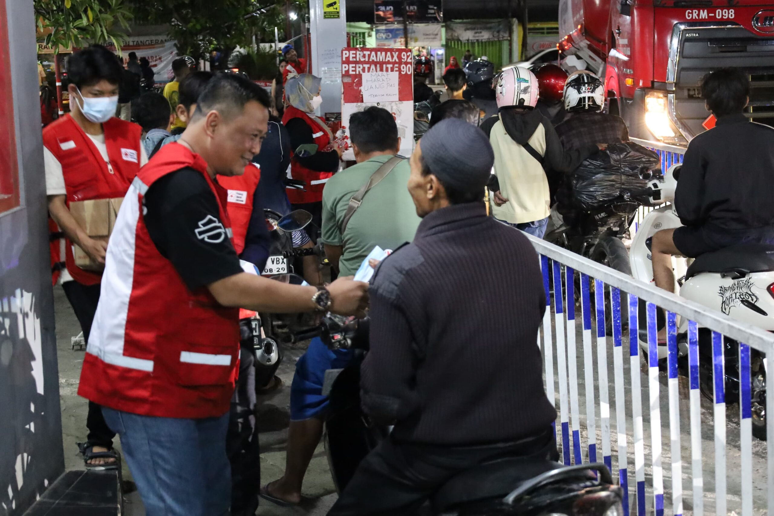 KANALTANGERANG.COM, CIKUPA – Memasuki arus mudik Hari Raya Idulfitri 1447H, PMI Kabupaten Tangerang berbagi air mineral dan masker ke para pemudik di Posko Siaga Lebaran PMI yang terletak di area pom Bensin Bojong, Cikupa, pada Rabu malam (18/3/2026).